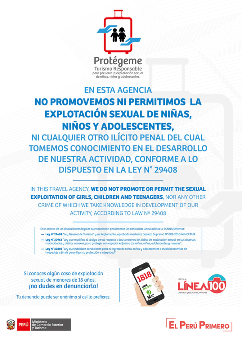 El Ministerio de Comercio Exterior y Turismo (MINCETUR) tiene como objetivo combatir y erradicar la Explotación Sexual de Niñas, Niños y Adolescentes (ESNNA) en el sector turístico.